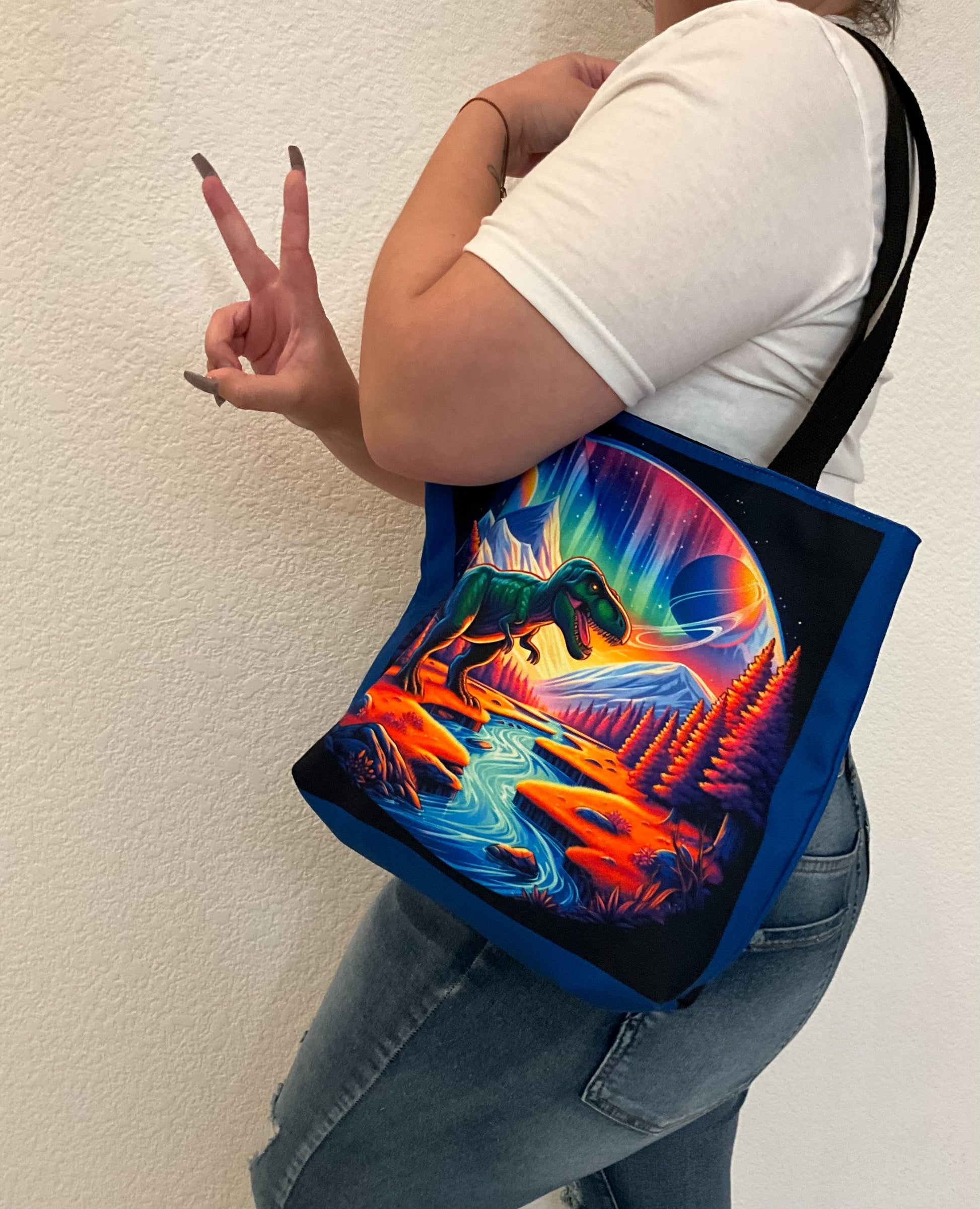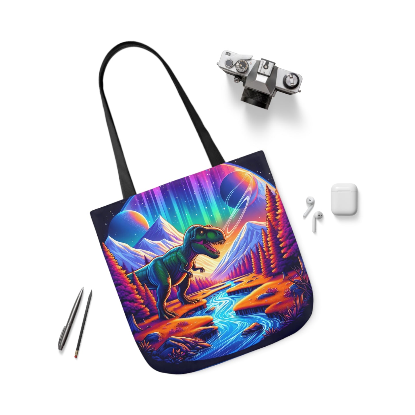 Vibrant tote bag of a T Rex in an alien planet. Bag is made out of polyester with black colored interior and is 18" x 18" inch.