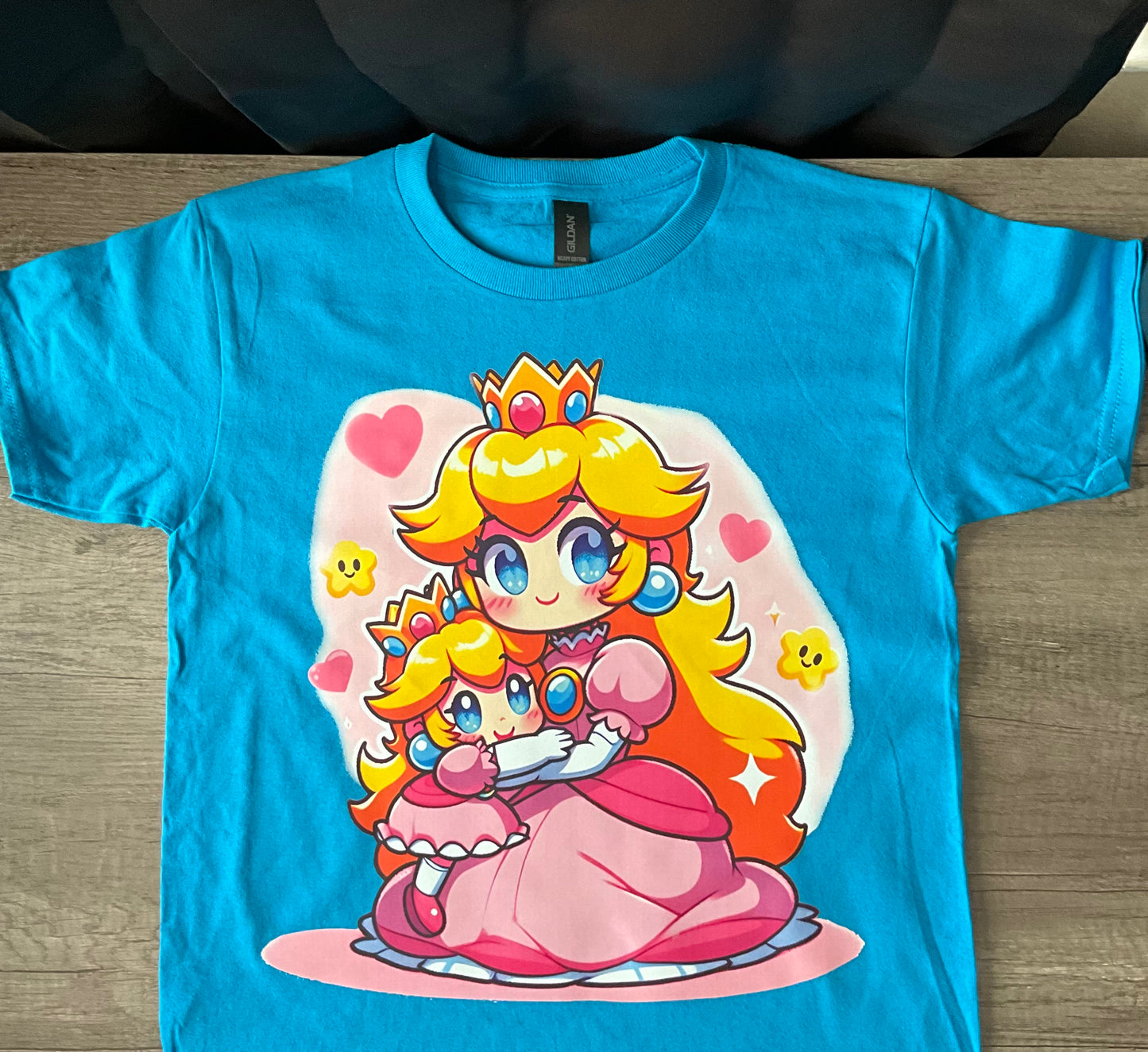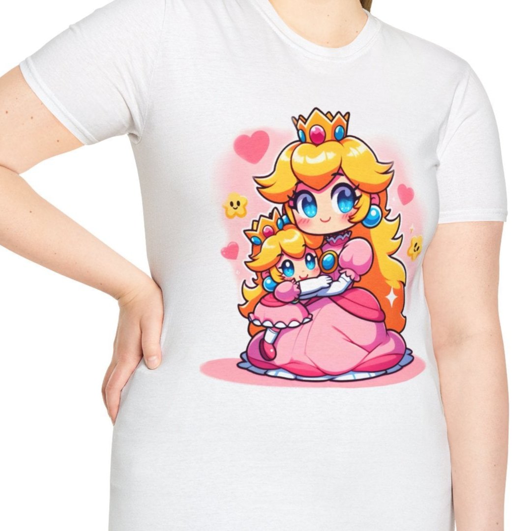 Cute shirt of Princes Peach for the mom in your life. Shirt is available in rose pink and in sizes small, medium, large and extra large. Shirt is Gildan brand unisex made out of cotton and polyester.